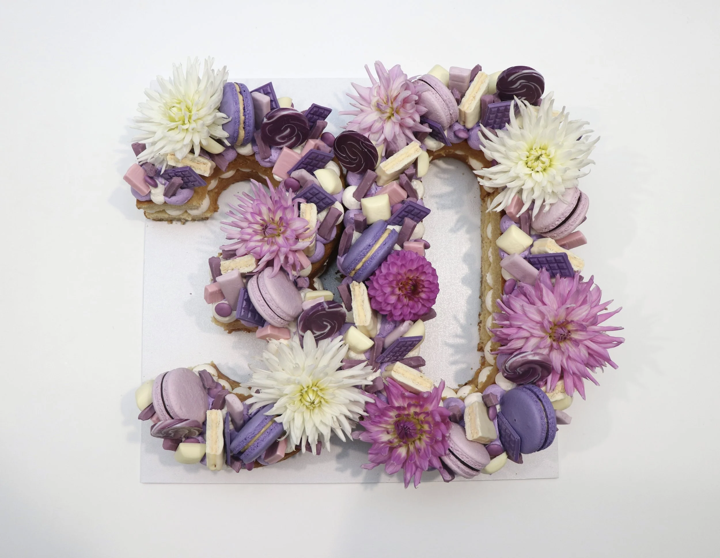 Vanilla or chocolate cake, topped with buttercream and an assortment of lollies, chocolates, meringues, macarons etc to match your party colour scheme. Fresh flowers are an additional $30.